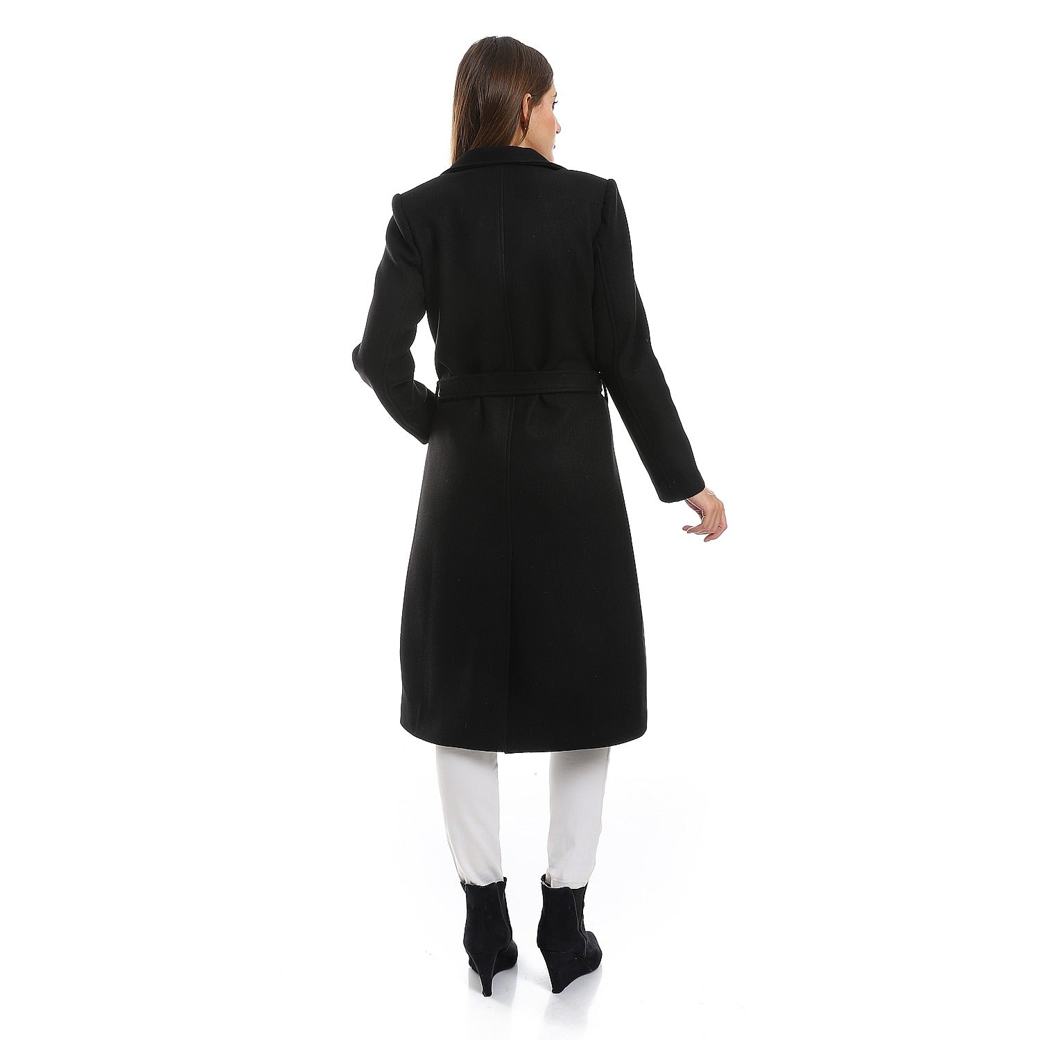 Designed for timeless sophistication, this black belted coat combines premium Gokh fabric with a flattering tailored cut. Perfect for layering during colder seasons, it’s a versatile piece that adds polish to any look.