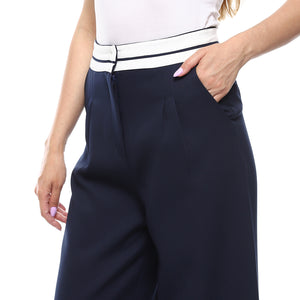 Wide-Leg High-Waist Pants with Trim ƒ?? Navy Blue