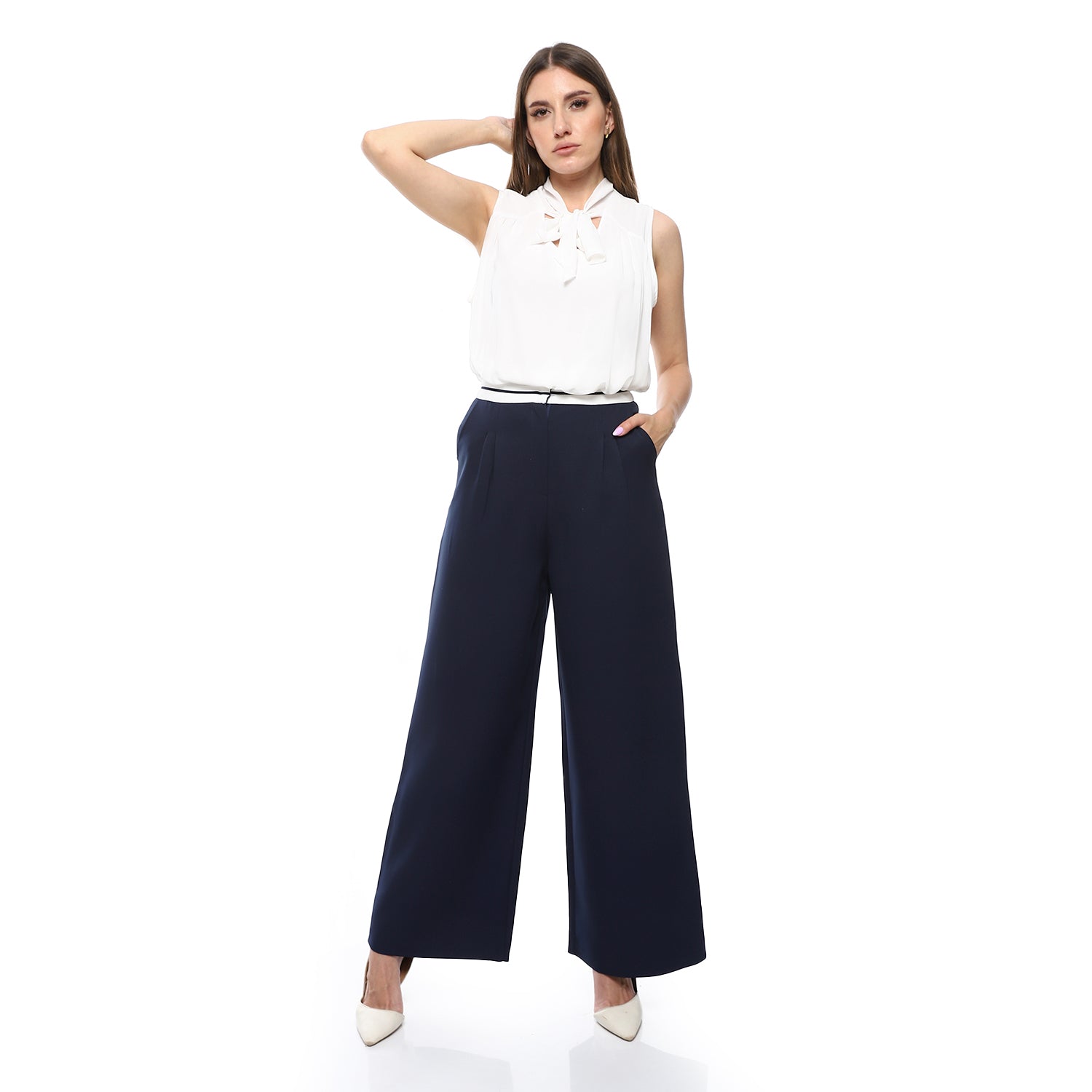 Step out in confidence with these navy blue wide-leg pants, designed for both comfort and sophistication. Featuring a chic white trim waistband and a flowy silhouette, they bring effortless elegance to your look—perfect for work, evenings, or casual outings.