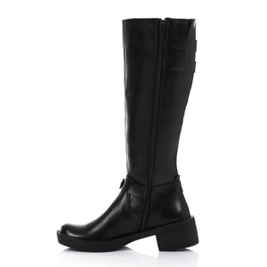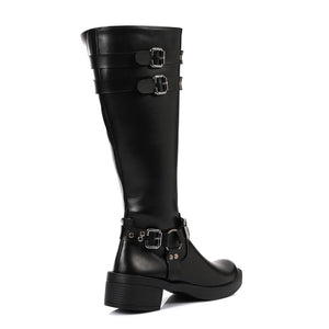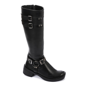 Command attention with these bold knee-high boots designed to elevate your everyday style. Made from premium PU leather, they feature sleek metal buckles and decorative straps that add a touch of attitude to any outfit. The block heel and durable rubber sole ensure both comfort and stability, making them perfect for confident steps all day long.