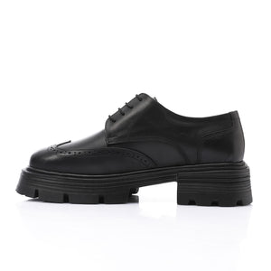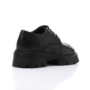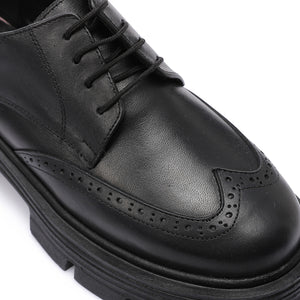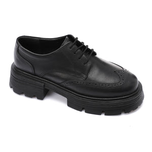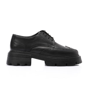Classic meets modern with these bold black chunky brogues. Crafted from genuine leather with detailed stitching and perforated design, this shoe offers both durability and timeless elegance. The wide fit ensures comfort, while the 4 cm chunky heel adds extra height and attitude. Finished with an adjustable lace-up closure for a secure fit, this pair is a perfect mix of comfort and confidence.