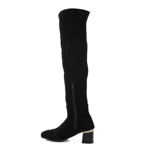 Step into sophistication with these elegant over-the-knee boots crafted from stretchable suede material. Designed for both comfort and style, they feature a block heel for stability and a mid-calf zipper closure for a secure, easy fit. The statement gold buckle detail adds a luxurious touch, making these boots a standout piece in any outfit.