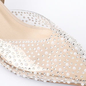 Step into elegance with these crystal-embellished slingback flats. Crafted from sheer material adorned with sparkling rhinestones, they offer a delicate balance of comfort and glamour. The pointed toe elongates the foot, while the low heel and secure slingback strap ensure effortless sophistication and all-day comfort.