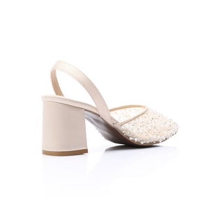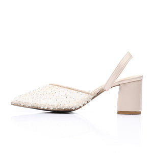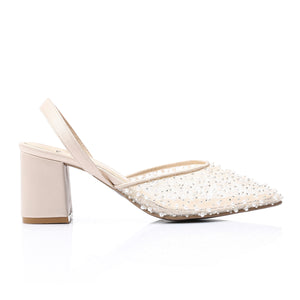 Add a touch of luxury to your look with these rhinestone-embellished slingback heels. Crafted with a sheer mesh upper and adorned with pearls and sparkling stones, this elegant design blends glamour with comfort. The pointed toe and mid block heel make it ideal for weddings, parties, and special occasions.