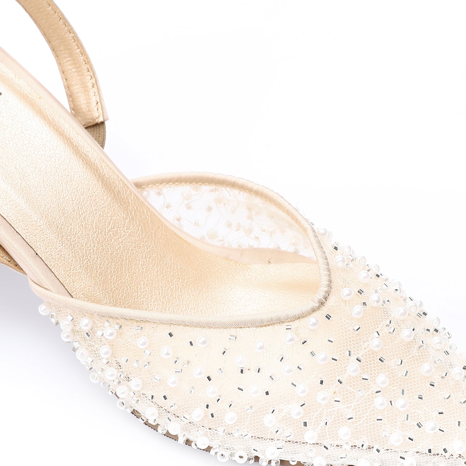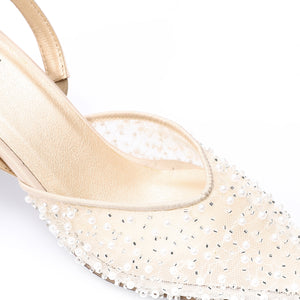 - Upper Material: Sheer Mesh with Rhinestone and Pearl Embellishments