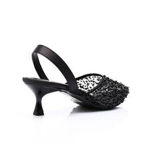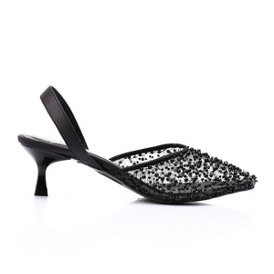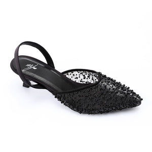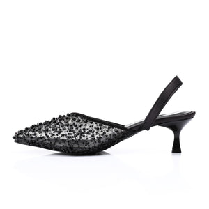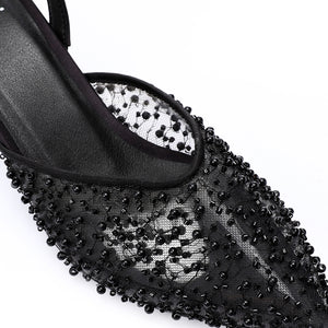 Elevate your look with these black rhinestone-embellished slingback kitten heels — the perfect mix of elegance and comfort. Crafted from sheer mesh and adorned with delicate black beads and stones, this design adds a glamorous sparkle to any outfit. The pointed toe and low kitten heel offer timeless sophistication, making it ideal for formal events or evening outings.