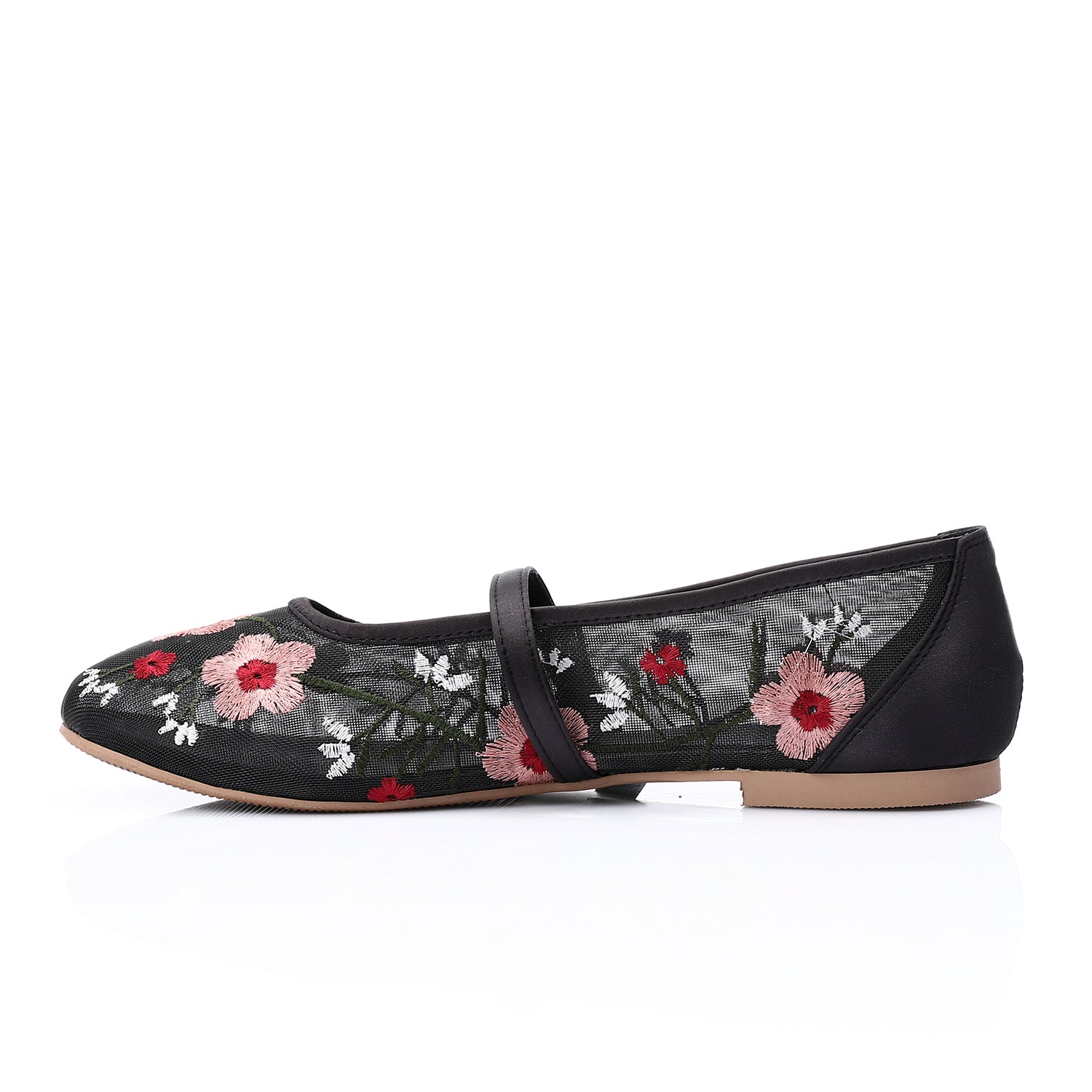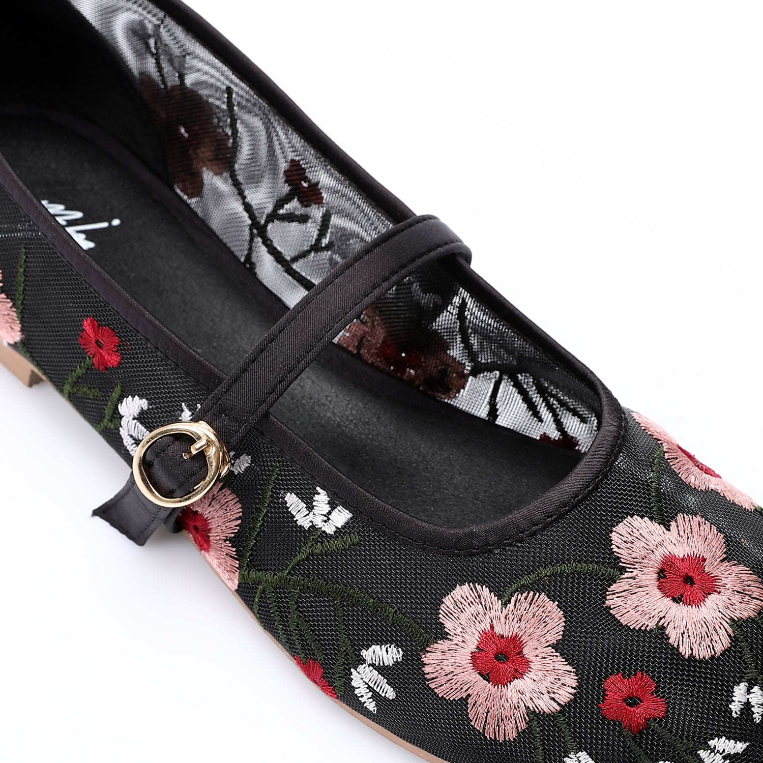 Bring a touch of romance to your everyday style with these Floral Charm Mary Jane Flats. Crafted from breathable mesh adorned with delicate embroidered flowers, this design blends comfort and femininity effortlessly. The adjustable strap adds a secure fit, while the flexible sole ensures easy all-day wear — perfect for pairing with dresses, skirts, or jeans.