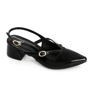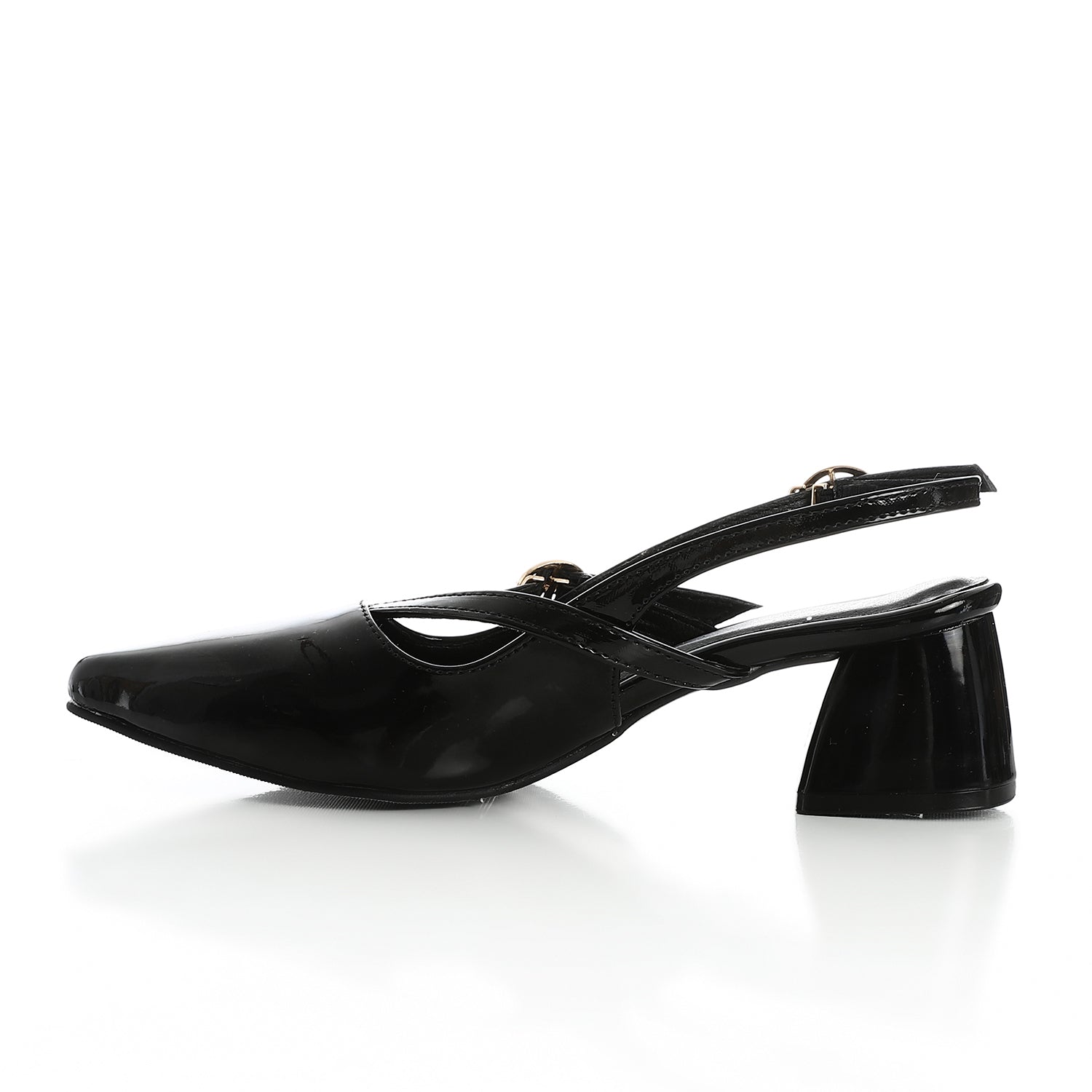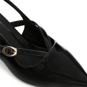 Make a chic statement with these elegant Verne Cross Slingback Heels. Crafted from glossy faux leather for a sophisticated finish, they feature a sharp pointed toe and adjustable cross straps with gold-tone buckles for a secure fit. The mid-height block heel offers comfort and balance, making this pair perfect for both formal events and stylish daily wear.