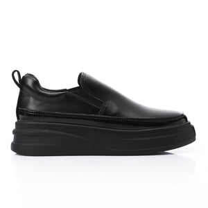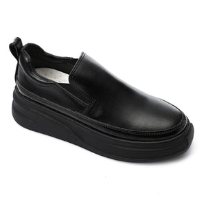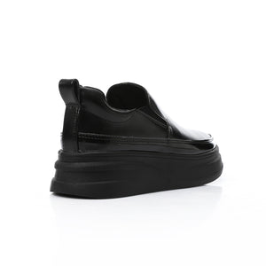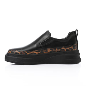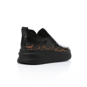 Make a bold statement with these Black Slip-On Platform Sneakers. Crafted from sleek synthetic leather, they feature a subtle leopard-print accent around the midsole that adds a trendy, wild touch. The slip-on design with elastic side inserts ensures easy wear and a comfortable fit, while the 5 cm rubber platform sole offers both height and support. Perfect for adding an edgy twist to your casual outfits.