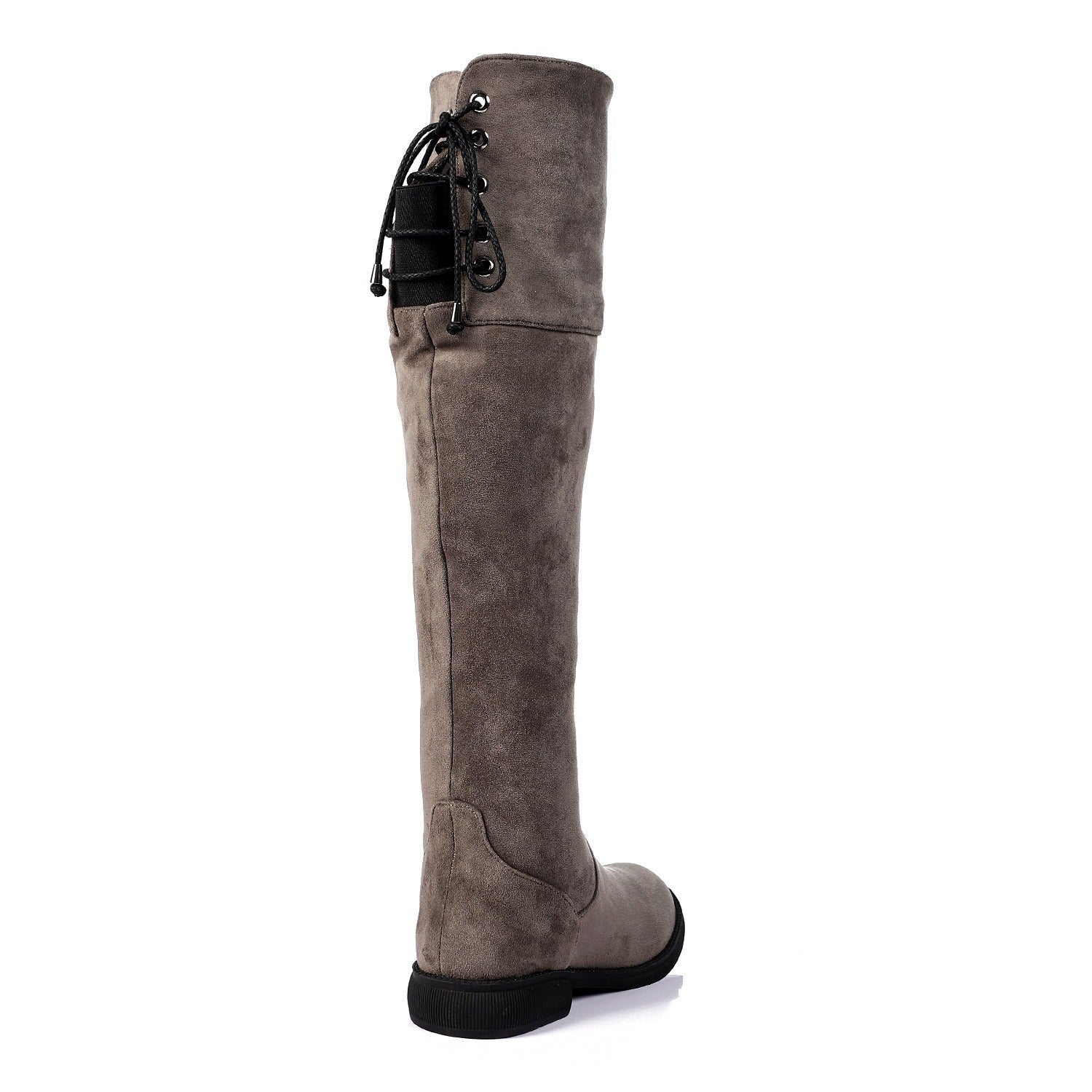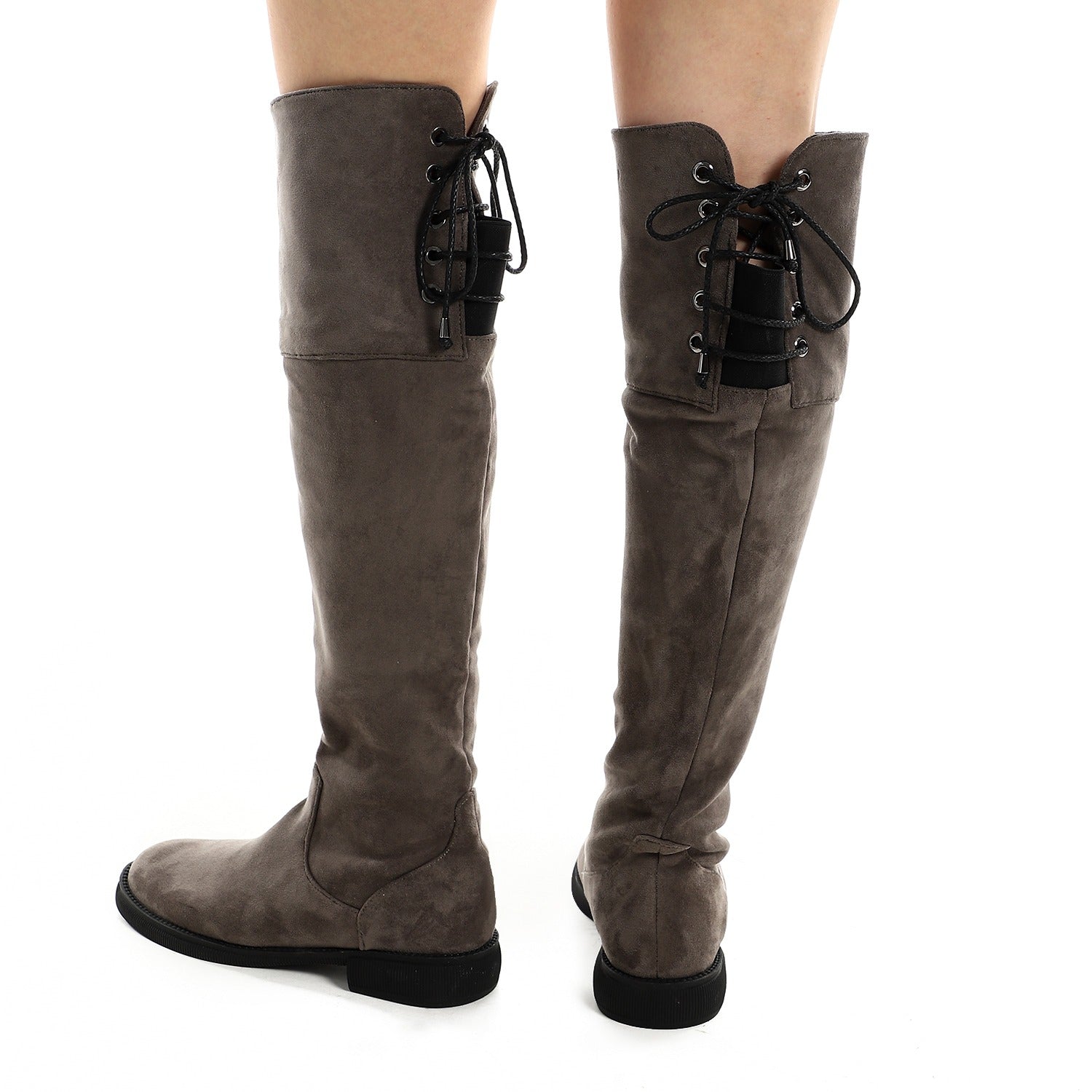 Elevate your winter style with these Elegant Over-The-Knee Suede Boots. Crafted from premium suede for a smooth, soft touch, these boots feature a sleek oval toe and a practical lace-up detail at the back for a customizable fit. The hard rubber sole ensures durability and comfort, while the neutral grey tone makes them versatile enough to pair with dresses, skirts, or skinny jeans.