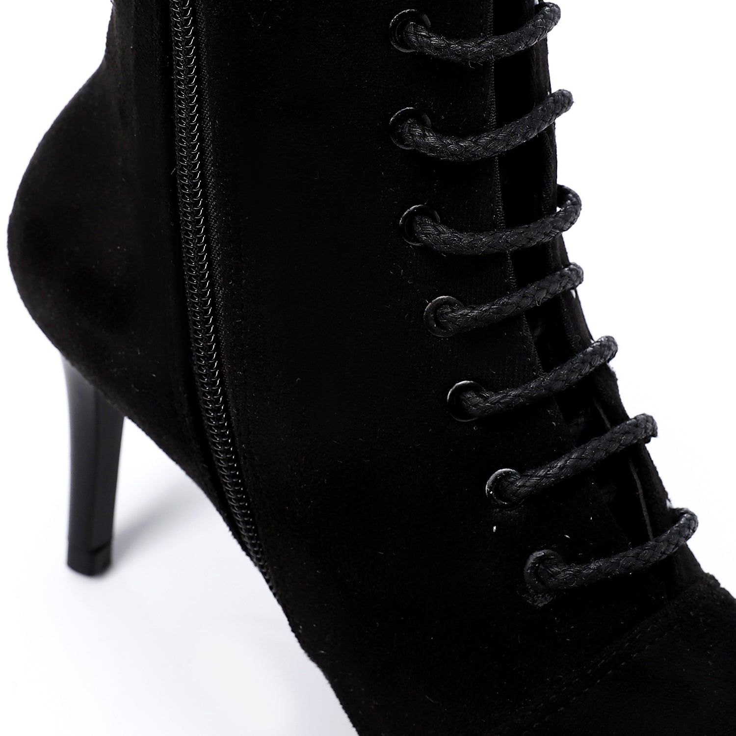 Add a touch of timeless elegance to your winter wardrobe with these Black Suede Lace-Up Ankle Boots. Designed with a sleek pointed toe and a slim stiletto heel, they bring sophistication to both day and night looks. Crafted from soft suede with a comfortable textile lining, they offer style and comfort in equal measure. The lace-up front and side zipper ensure a perfect fit with effortless wearability.