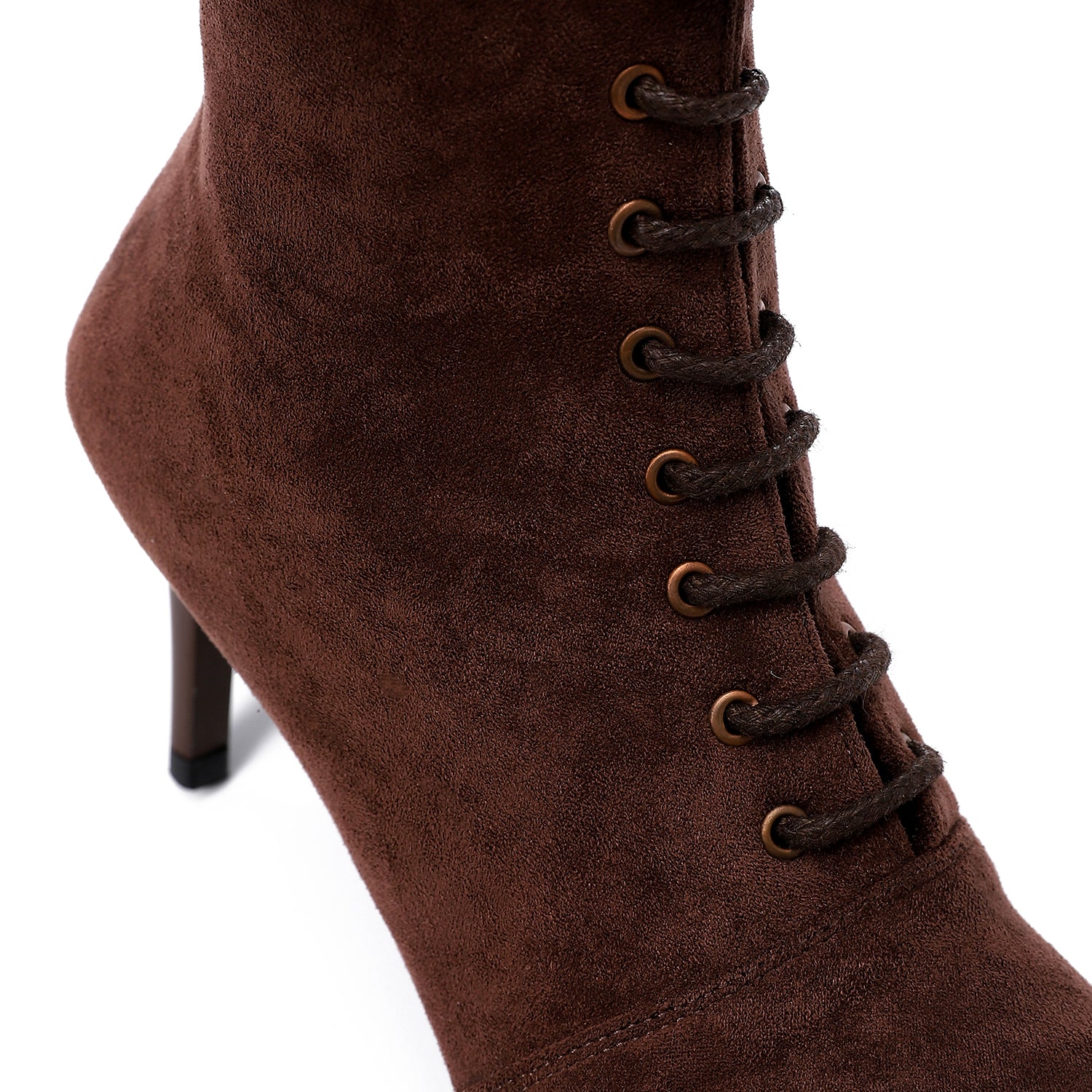 Add a touch of timeless elegance to your winter wardrobe with these Black Suede Lace-Up Ankle Boots. Designed with a sleek pointed toe and a slim stiletto heel, they bring sophistication to both day and night looks. Crafted from soft suede with a comfortable textile lining, they offer style and comfort in equal measure. The lace-up front and side zipper ensure a perfect fit with effortless wearability.