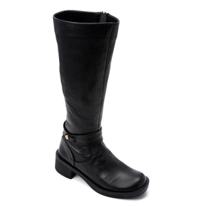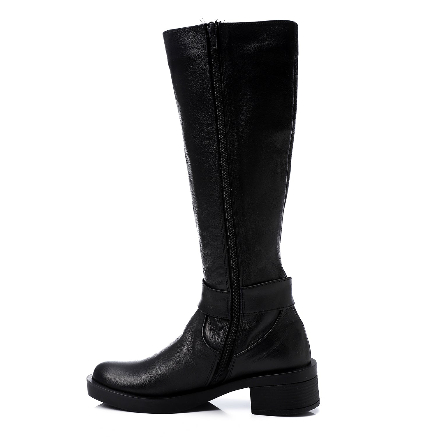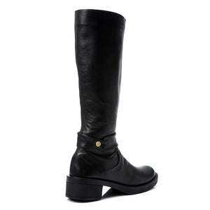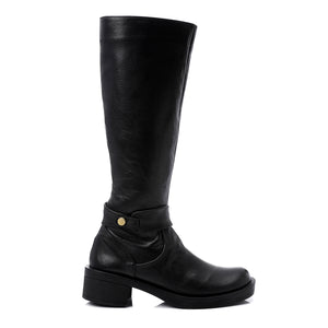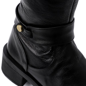 Step into timeless sophistication with these Classic Black Leather Riding Boots. Crafted from smooth leather, these mid-calf boots feature a sleek silhouette with a round toe, a solid block heel, and a subtle buckle-ring accent that adds a touch of character. The slip-on design ensures ease of wear, while the hard rubber sole offers excellent durability and traction — perfect for daily wear or a refined winter look.