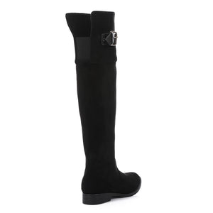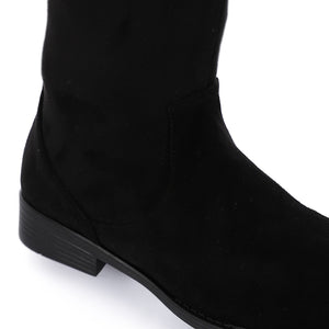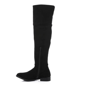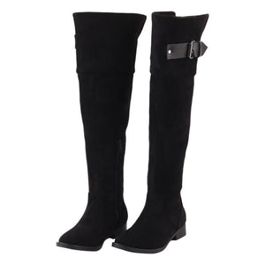 Elevate your winter wardrobe with these stunning Black Over-the-Knee Boots. Crafted from stretchable suede material for a sleek, snug fit, they combine elegance with comfort. The chic buckle detail at the top adds a refined touch, while the low block heel ensures effortless wear throughout the day. With a convenient side zipper, these boots blend practicality and sophistication — perfect for both casual and dressy occasions.