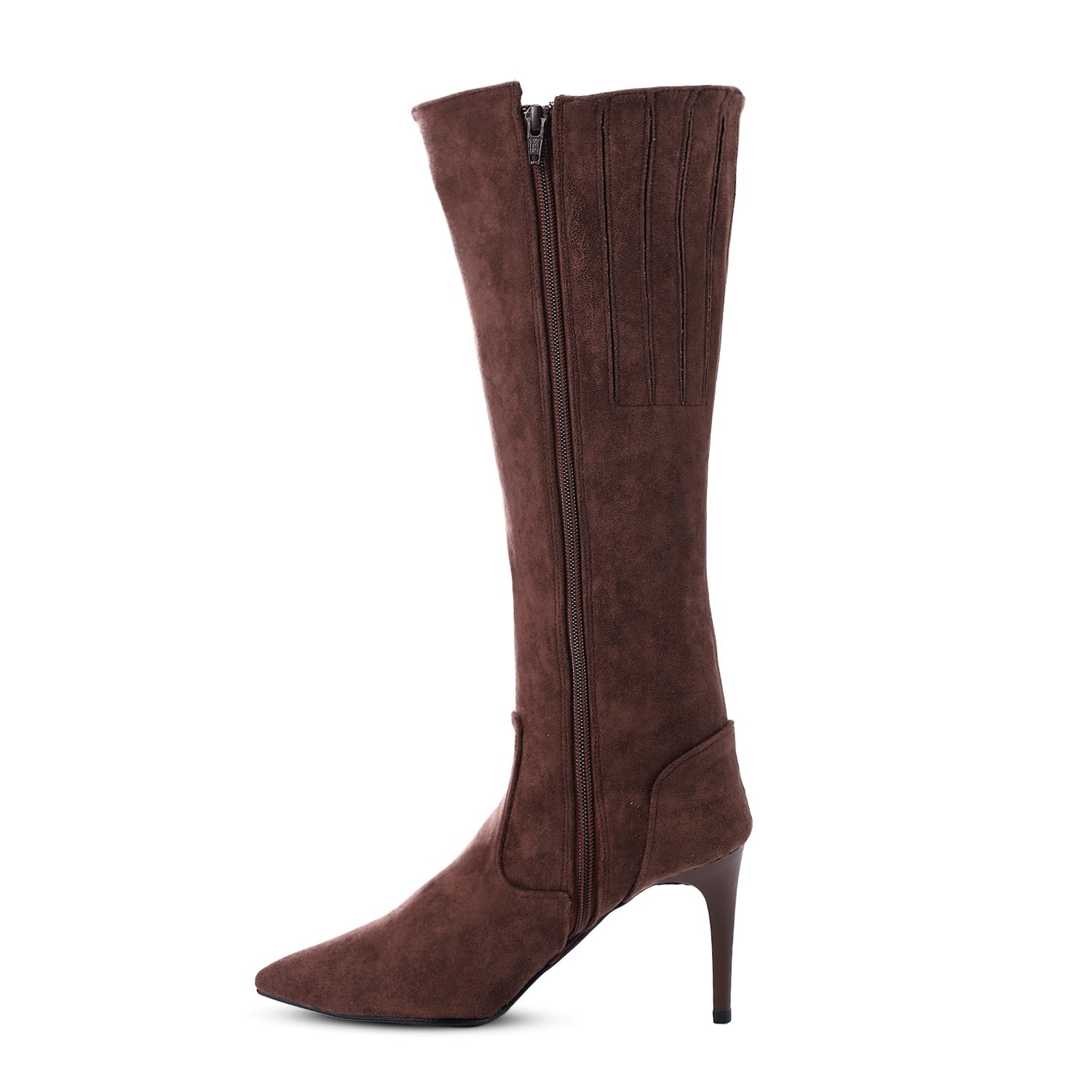 Turn heads this season with these sophisticated Brown Suede Knee-High Boots. Made from soft suede for a refined, luxurious look, these boots feature a sleek pointed toe and slim high heel that elongates your legs beautifully. The inner textile lining ensures comfort, while the durable rubber sole provides stability and traction. Finished with a side zipper for easy wear, these boots are a statement of effortless elegance.