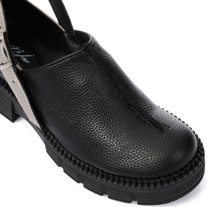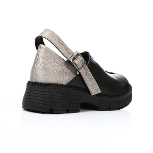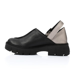 Embrace versatility and style with these Two-Tone Slingback Loafers. Designed for both comfort and sophistication, this unique pair blends the charm of classic loafers with the airy ease of espadrilles. Crafted from premium faux leather with a metallic silver back strap, it offers all-day comfort and durability. The sturdy rubber sole ensures excellent traction, while the adjustable buckle allows for a perfect fit.