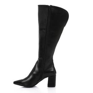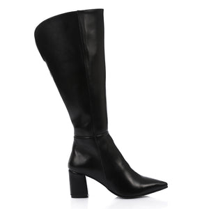 Turn up the sophistication with the Midnight Edge Boots — a sleek design crafted for bold, confident style. Made from premium faux leather with a soft textile lining, these knee-high boots feature a sharp pointed toe and a solid block heel that adds height without compromising comfort. The minimalist structure and clean silhouette make them a timeless wardrobe essential.