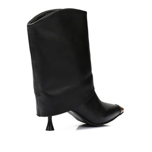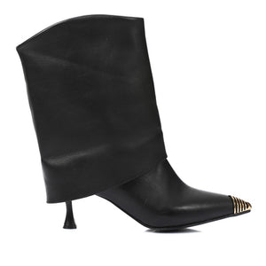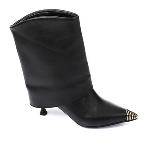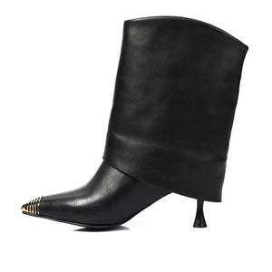 Step into confident sophistication with the Gold-Tip Slouch Leather Boots. Crafted from smooth genuine black leather, these boots feature a modern slouched silhouette that perfectly balances casual flair with high-end elegance. The pointed toe is adorned with striking metallic gold detailing, adding a bold touch of refinement to your look. Designed for both comfort and style, the soft foam and mesh lining keep your feet warm and cushioned, while the mid-height 5 cm stiletto heel gives a graceful lift without compromising on ease. With their wide ankle fit and effortless pull-on design, these boots are your go-to for standout style this season.