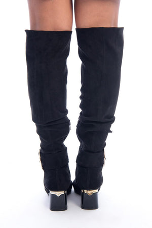 Crafted from stretchable suede material for a perfect fit, these boots add instant polish to any outfit. The elegant gold buckle detail and mid-calf zipper make them both practical and chic, while the block heel ensures stability and all-day comfort.