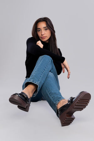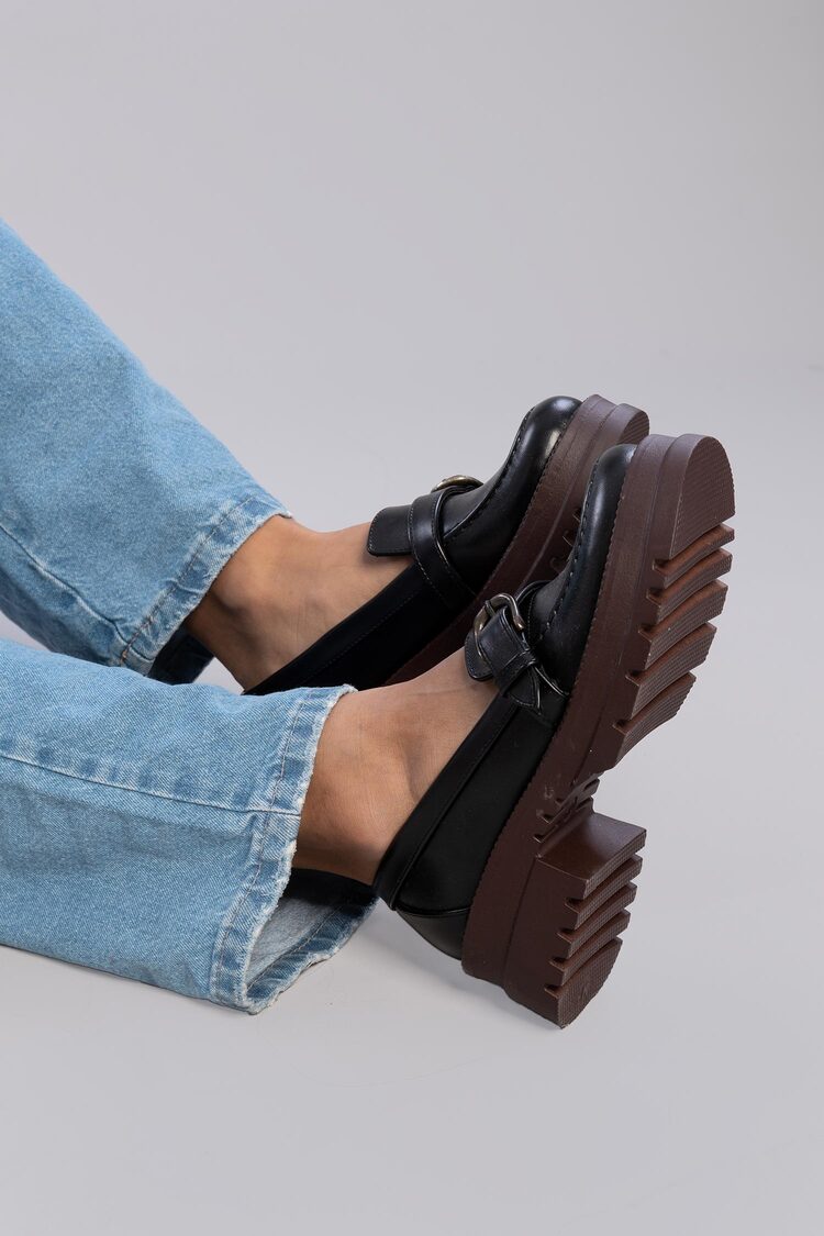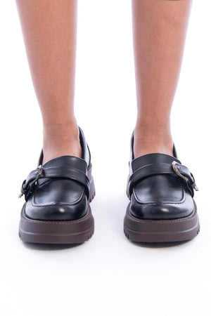Chunky Faux Leather Loafers with Brown Sole ƒ?? Black
