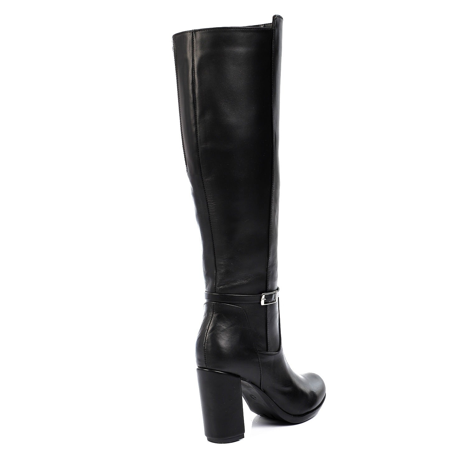 Crafted from smooth genuine leather, these boots offer a refined silhouette with a sleek buckle detail at the ankle. The high block heel provides both height and stability, making them ideal for effortlessly chic winter looks.