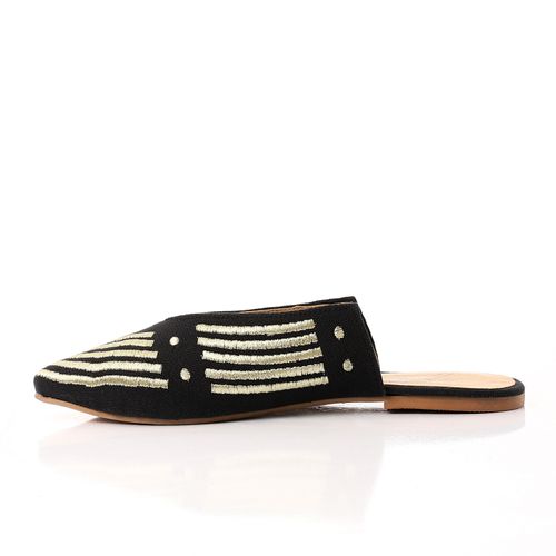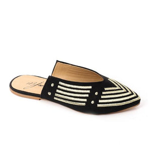 Elevate your casual style with these Striped Embroidered Slip-On Mules from Mr. Joe. Crafted with a chic pointed toe and intricate beige embroidery on a black canvas base, these mules bring a blend of bohemian elegance and everyday comfort. Perfect for effortless summer and spring looks.