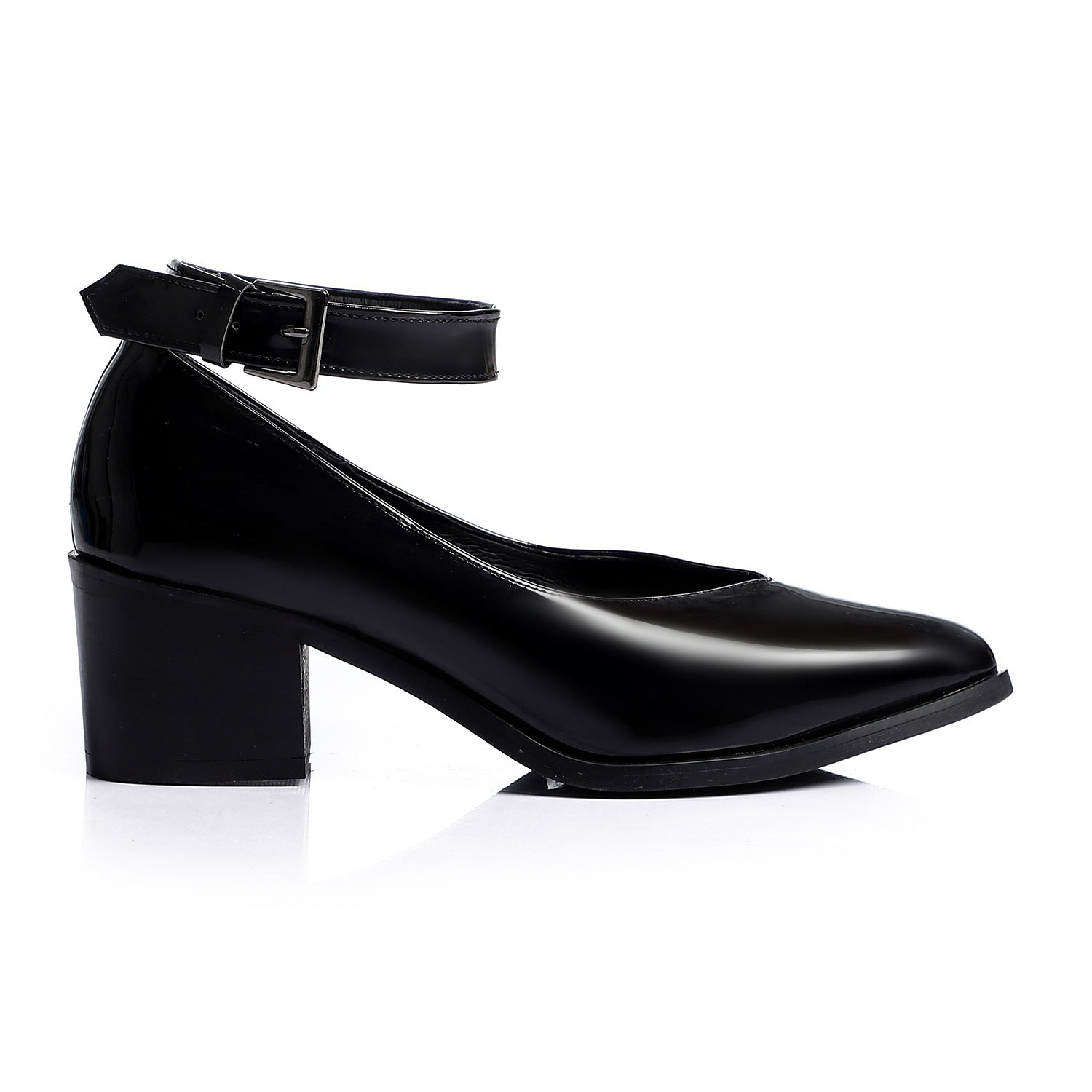 Step out with confidence in these sleek black ankle-strap heels, where timeless design meets a glossy modern finish.