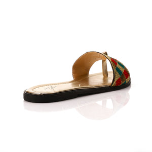 Step up your summer elegance with these woven flat slides, crafted with a blend of gold and burgundy tones for a rich, sophisticated touch.