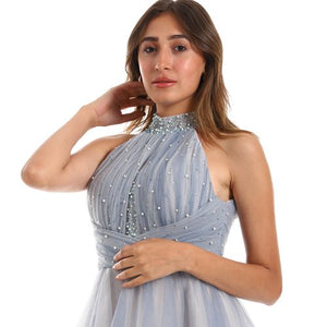 Radiate elegance and charm in this stunning Blue Beaded Halter Tulle Dress, designed to make you feel effortlessly graceful at every special occasion. The delicate tulle fabric flows beautifully, while the intricate beadwork adds a sparkling touch of sophistication.