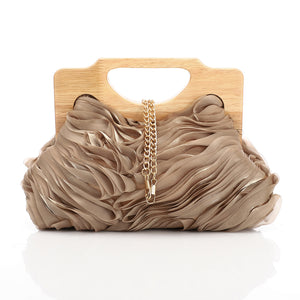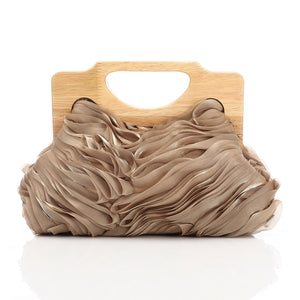 Chiffon Ruffled Evening Bag With Wooden Handle Brown