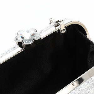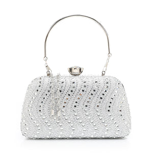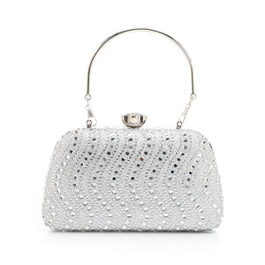 Designed to dazzle, this gold evening clutch is the ultimate statement of elegance. Adorned with intricate crystal embellishments arranged in graceful patterns, it reflects light beautifully from every angle. The structured silhouette is complemented by a refined metallic top handle and a jewel-inspired clasp, creating a timeless piece that elevates any formal look with effortless sophistication.