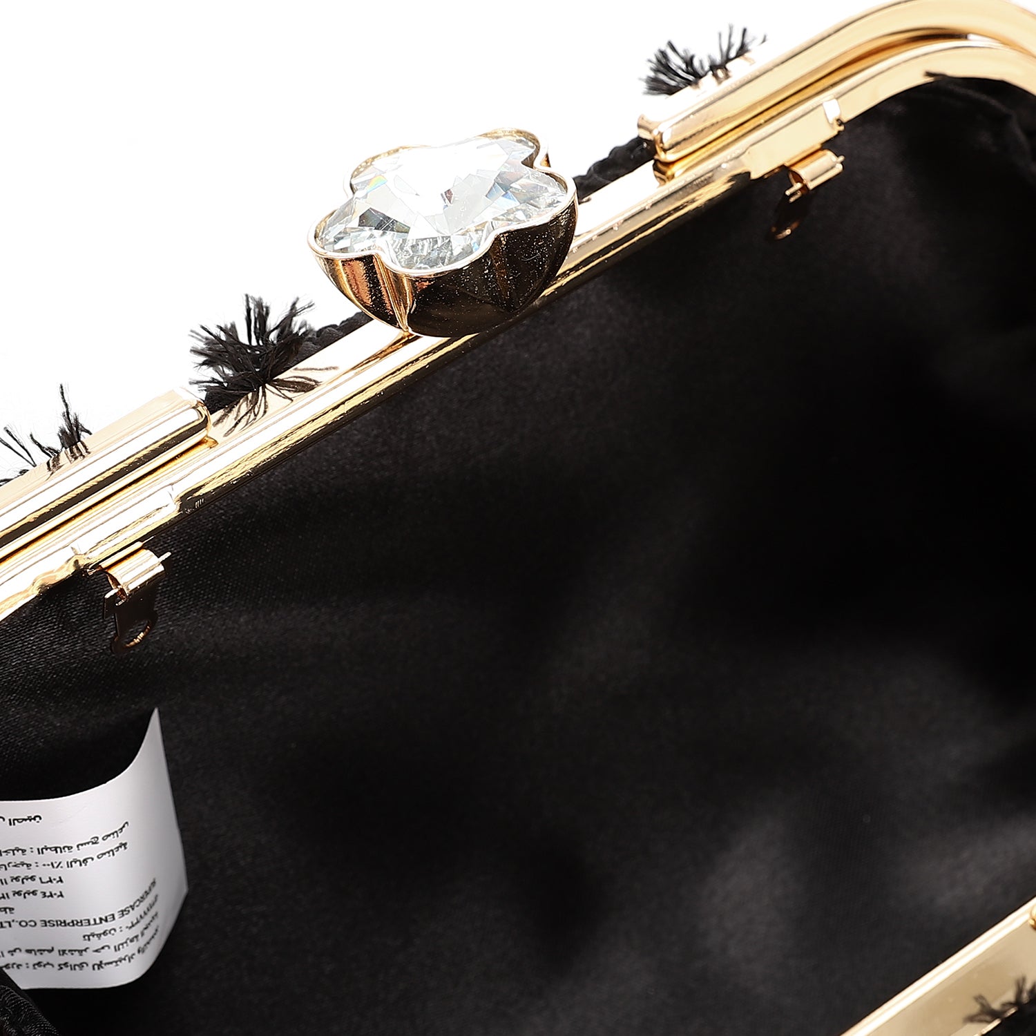 - Hardware: Gold-tone frame with crystal-encrusted edges and a floral jewel clasp