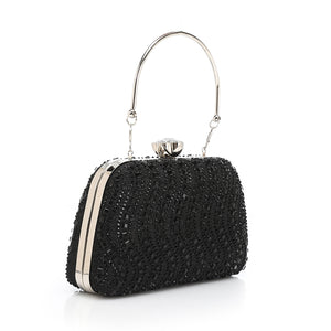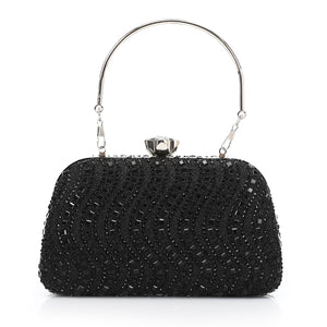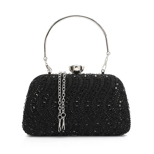 Designed to dazzle, this gold evening clutch is the ultimate statement of elegance. Adorned with intricate crystal embellishments arranged in graceful patterns, it reflects light beautifully from every angle. The structured silhouette is complemented by a refined metallic top handle and a jewel-inspired clasp, creating a timeless piece that elevates any formal look with effortless sophistication.