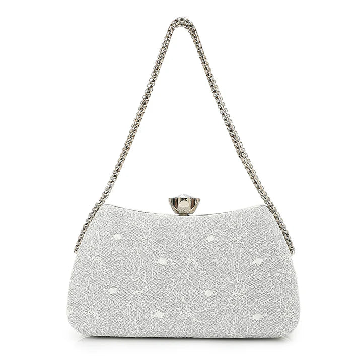 Design Details: Structured silhouette with lace-textured fabric and gemstone-style top clasp