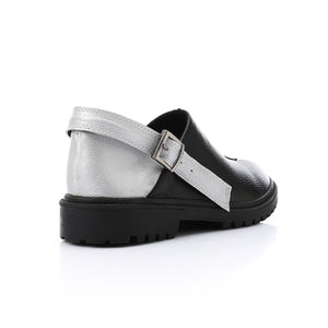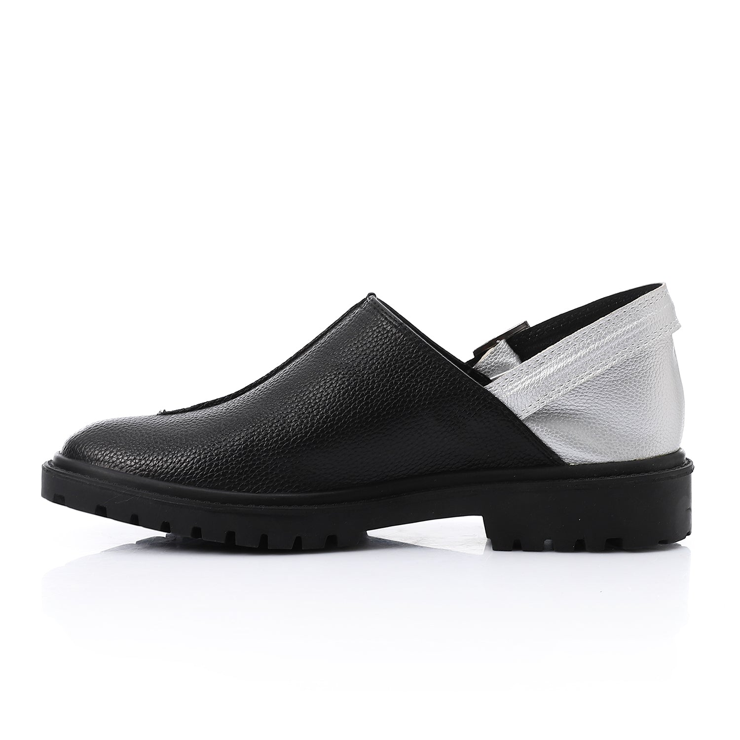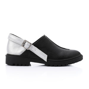 Embrace versatility and style with these Two-Tone Slingback Loafers. Designed for both comfort and sophistication, this unique pair blends the charm of classic loafers with the airy ease of espadrilles. Crafted from premium faux leather with a metallic silver back strap, it offers all-day comfort and durability. The sturdy rubber sole ensures excellent traction, while the adjustable buckle allows for a perfect fit.