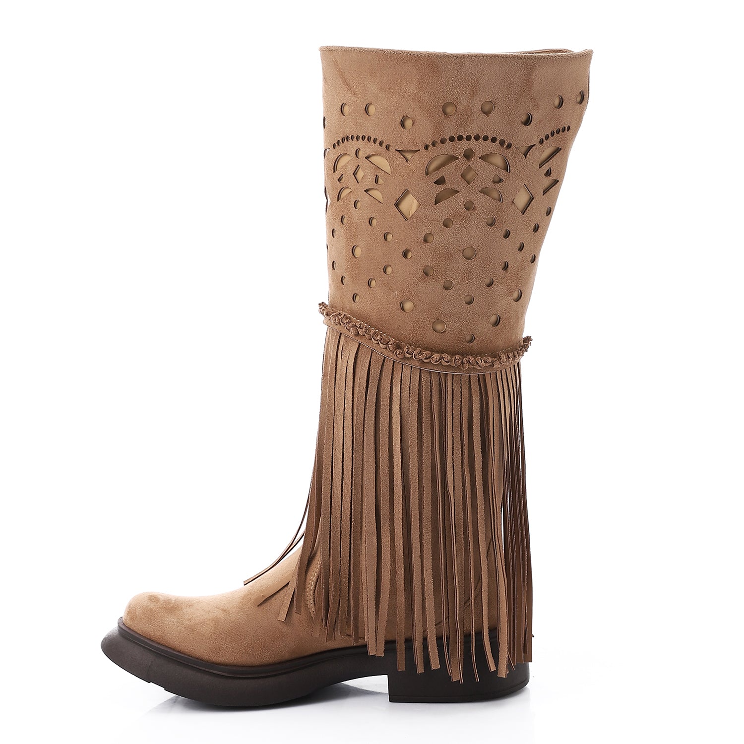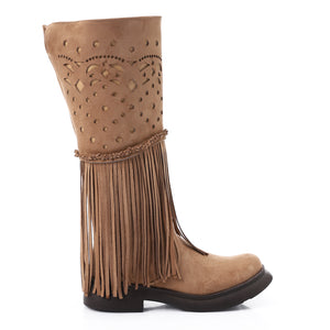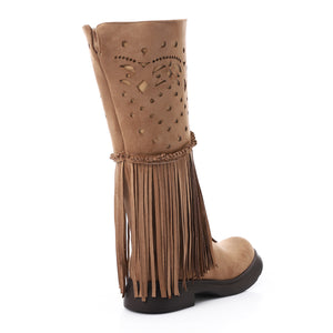 Add a bold, boho-chic touch to your style with these beige suede fringe boots. Designed for women who love unique, standout footwear, these mid-calf boots combine comfort, softness, and a Western-inspired look perfect for casual outfits and winter days.